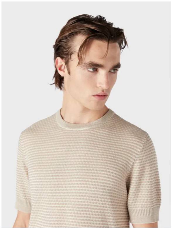 Pull ras-du-cou à manches courtes, réalisé en mélange de lyocell, une fibre semi-synthétique caractérisée par son très faible impact écologique sur l’environnement : produite à partir d’eucalyptus, elle est appréciée pour sa grande résistance, sa capacité à absorber l’humidité, sa remarquable respirabilité, ainsi que pour la particularité d’être un tissu qui ne marque pas de faux plis. Le tissage tricoté particulièrement léger avec un motif en relief exclusif crée un effet bicolore spécial all over